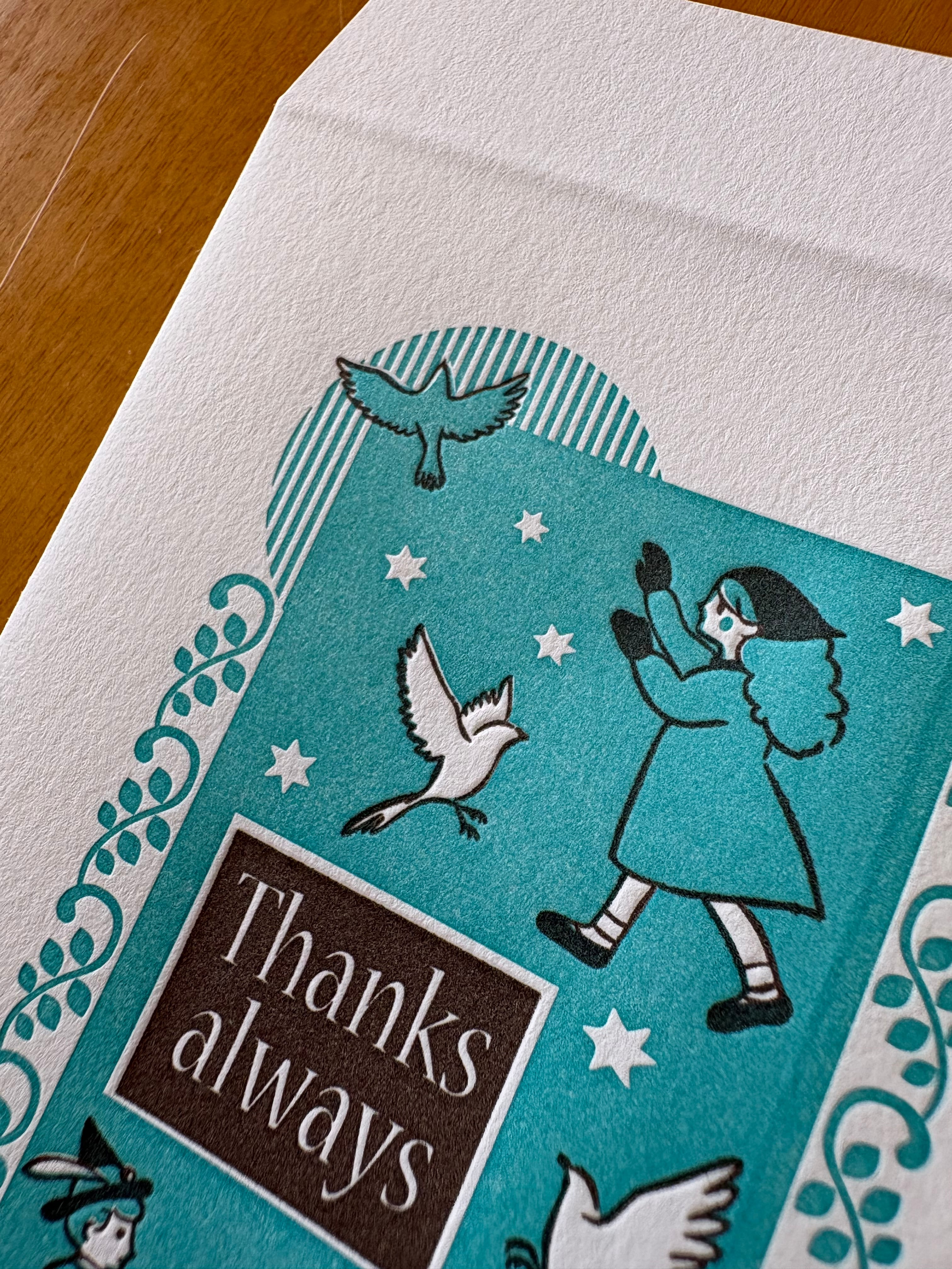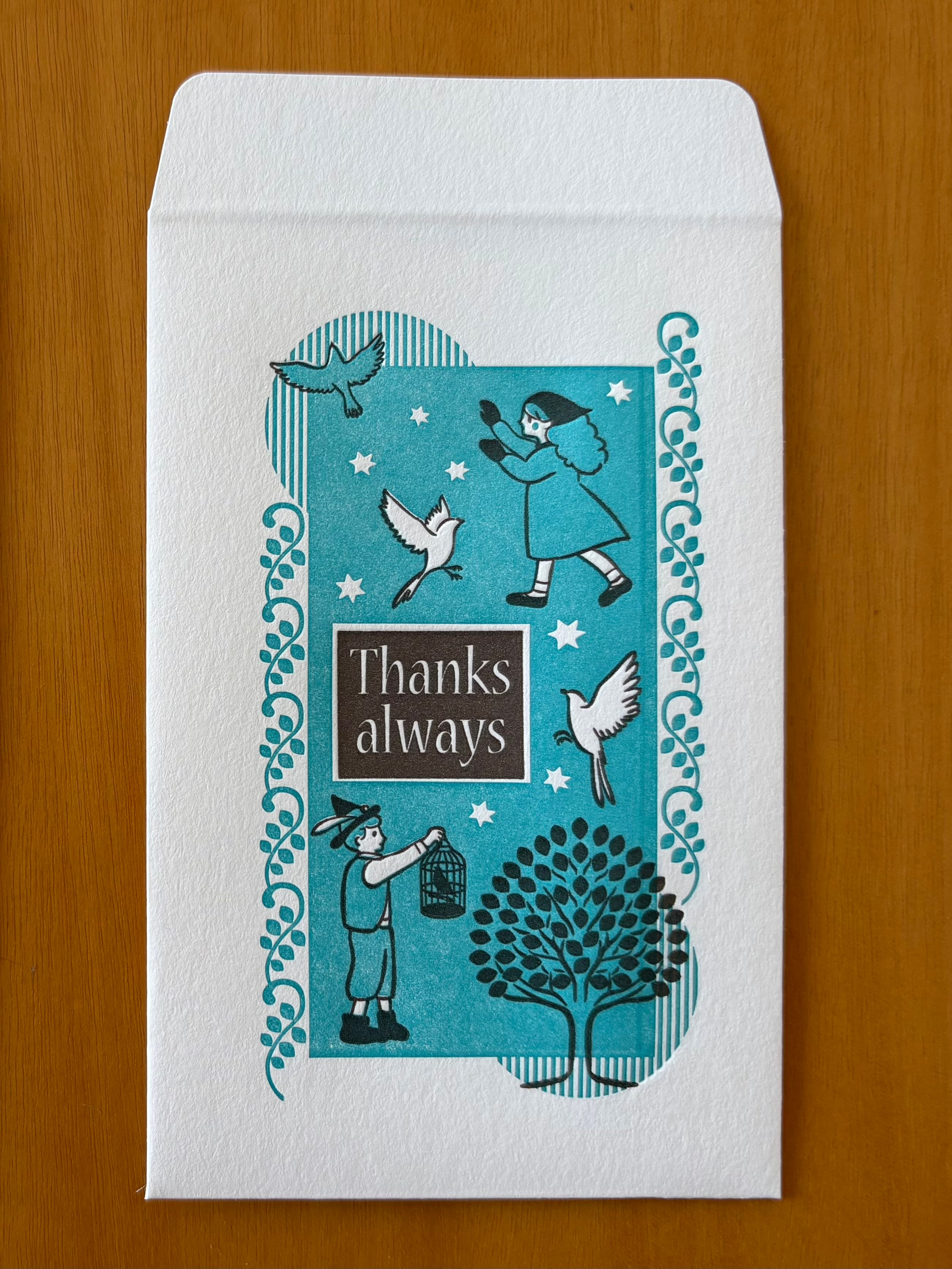 「青い鳥」の可愛い絵柄に「いつもありがとう」のメッセージが添えられていて、小さなものを贈るのにぴったりです。