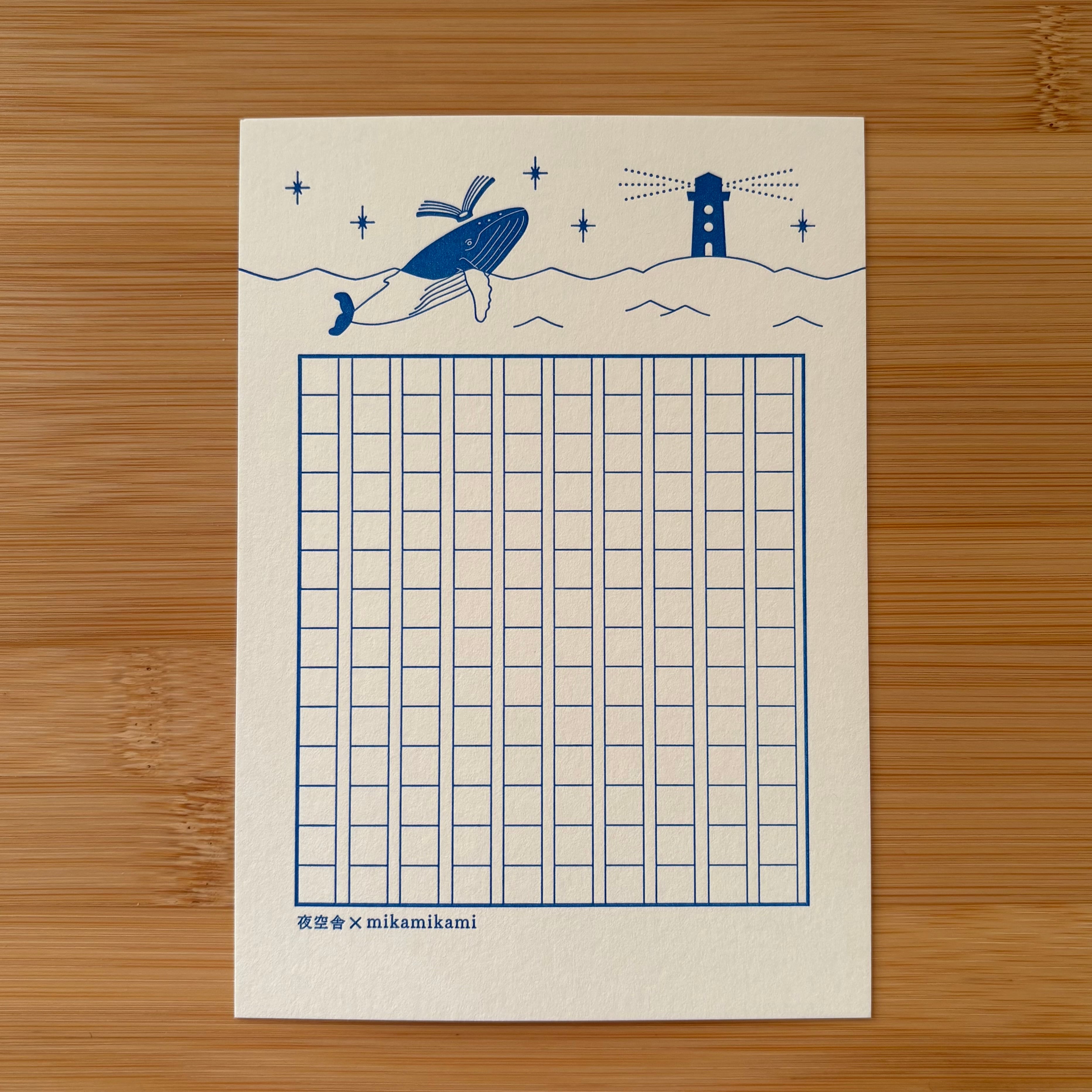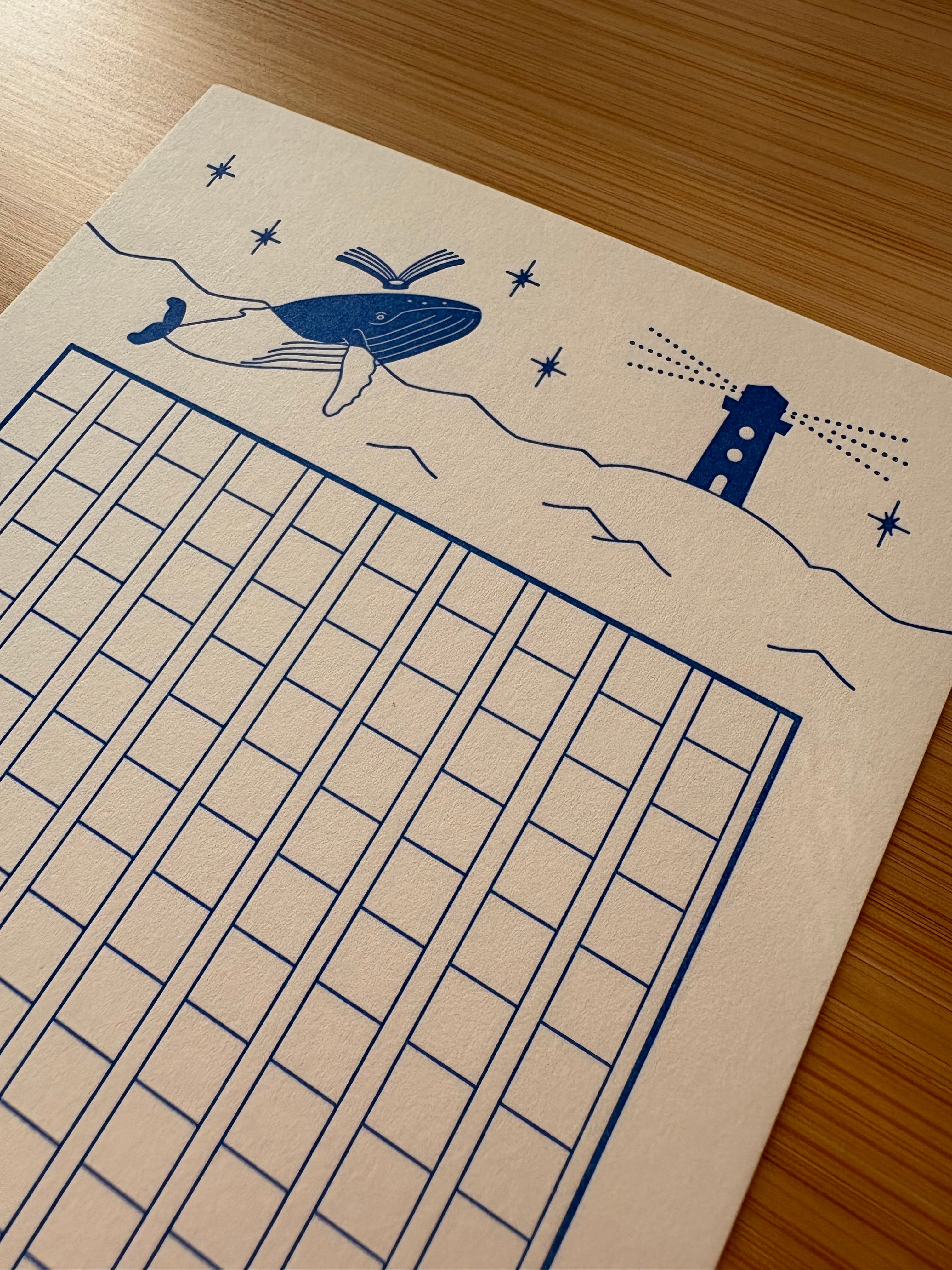 鯨と灯台のイラストが描かれた、懐かしい雰囲気のある活版印刷です。