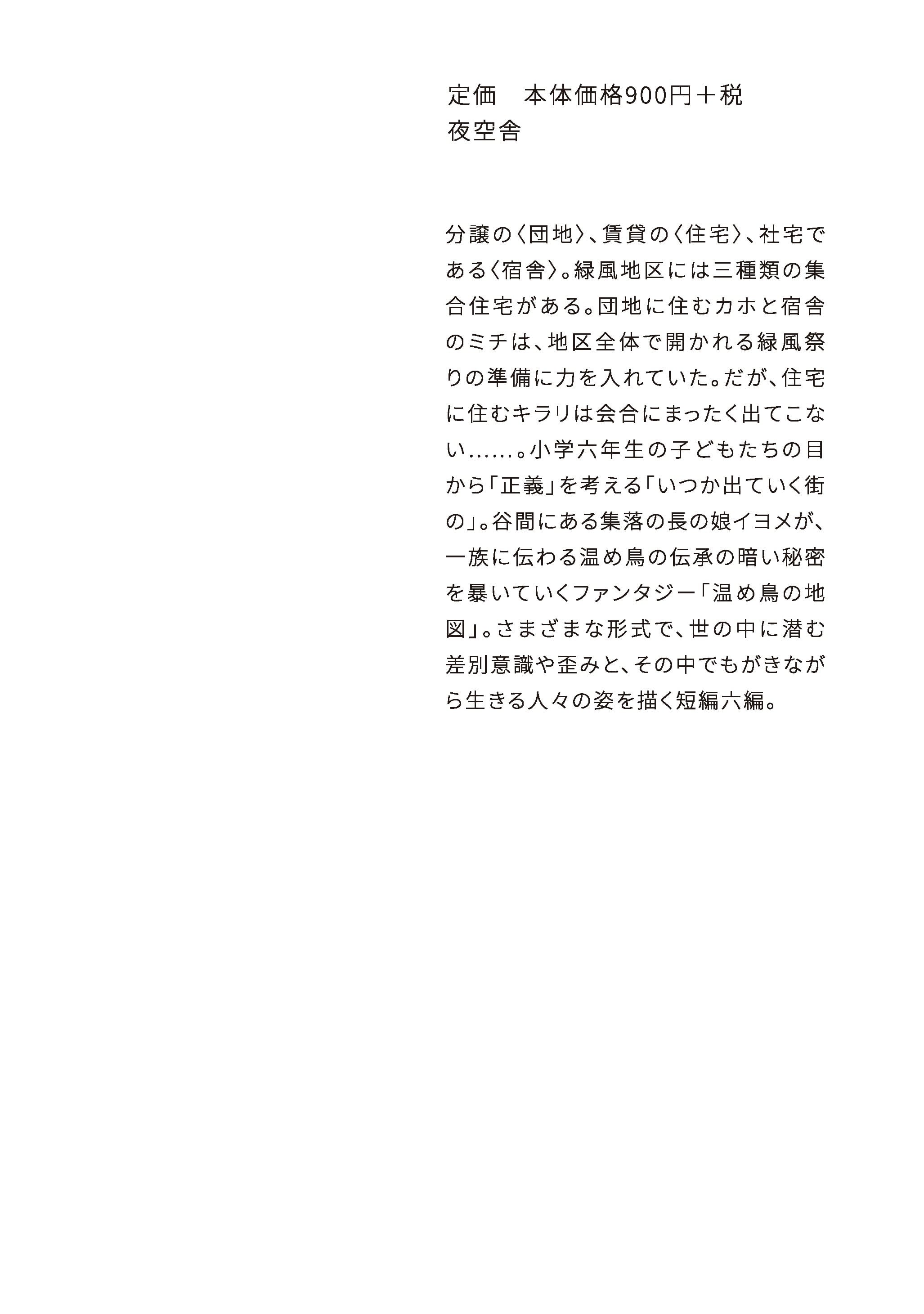 分譲の〈団地〉、賃貸の〈住宅〉、社宅である〈宿舎〉。緑風地区には三種類の集合住宅がある。団地に住むカホと宿舎のミチは、地区全体で開かれる緑風祭りの準備に力を入れていた。だが、住宅に住むキラリは会合にまったく出てこない……。小学六年生の子どもたちの目から「正義」を考える「いつか出ていく街の」。谷間にある集落の長の娘イヨメが、一族に伝わる温め鳥の伝承の暗い秘密を暴いていくファンタジー「温め鳥の地図」。さまざまな形式で、世の中に潜む差別意識や歪みと、その中でもがきながら生きる人々の姿を描く短編六編。